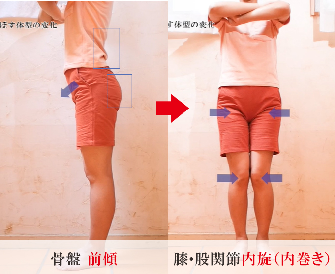 腰の反り(腰椎の前彎)、あるいは骨盤の前傾が強い場合=股関節は内旋状態となります。(※)例外もあります